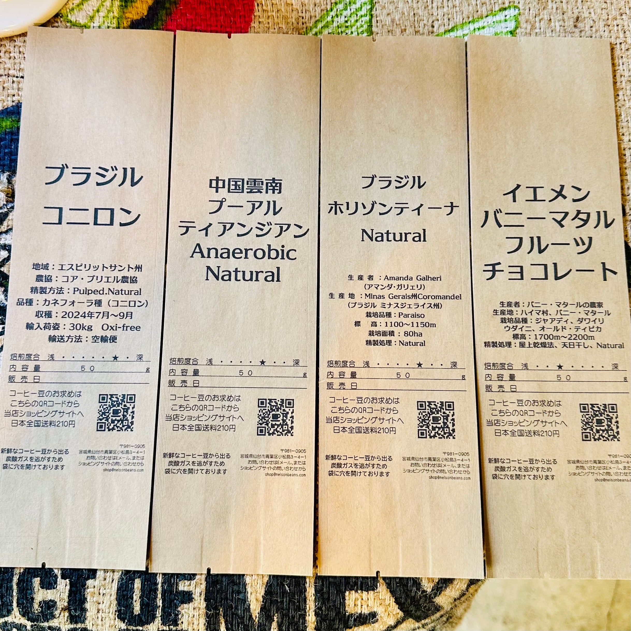 焙煎度合いは(1)のイエメンは中煎りミディアムロースト程度。(2)と(3)は中煎りやや深め(4)は深煎りでお届け予定です。